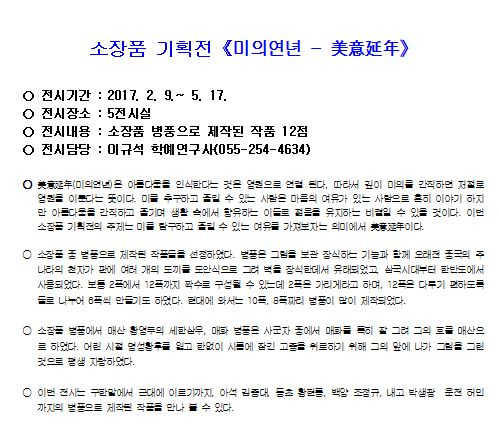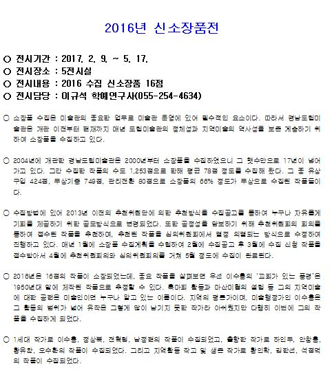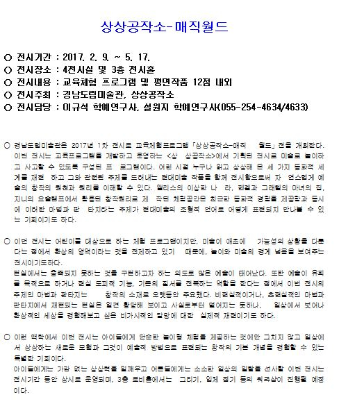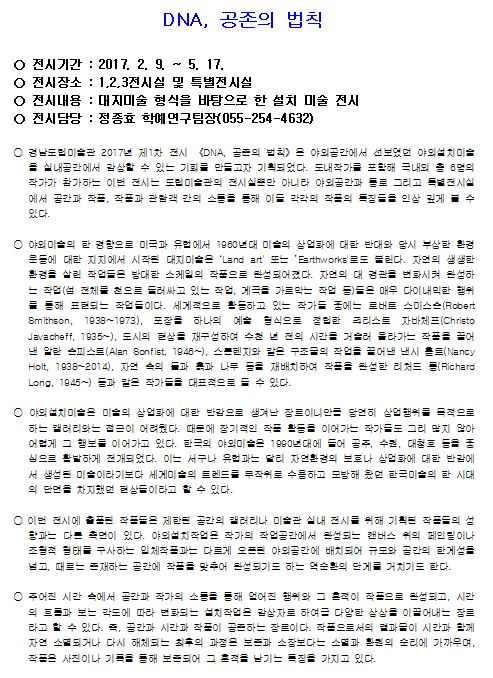 경남도립미술관, 2017년 첫 전시 개막- ‘DNA, 공존의 법칙’, ‘상상공작소-매직월드’ 등 4가지 전시회- 가족 모두 즐길 수 있는 다양한 전시회 동시 개막경남도립미술관 2017년 첫 전시가 오는 9일부터 5월 17일까지 미술관 전관에서 동시 개막한다. 정유근 기자 / |