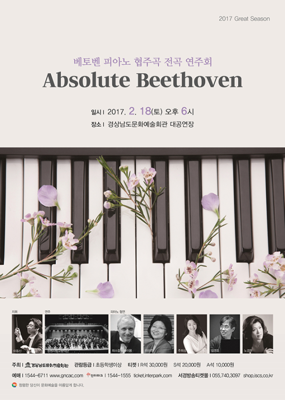 제4번 협주곡은 아스펜 음악제와 줄리아드 음악대학, 맨하튼 음학대학 오디션 우승자이며 한국을 대표하는 피아니스트 김영호가 연주한다. 이 곡은 부드러운 낭만성과 함께 때로는 거장적인 모습을 드러낸다. 피아노 소나타 작곡가로서의 면모와 교향곡 작곡가로서의 면모가 이 협주곡에 잘 융합되어 있다. 제5번 협주곡은 한국인 최초로 벨기에 퀸엘리자베스 콩쿠르 입상자이자, 비오티 콩쿠르 우승자인 피아니스트 이미주가 연주한다. 이 곡은 ‘황제’라는 명칭으로 친숙해져 있는데, 베토벤이 붙인 명칭은 아니다. 다만, 곡 자체가 당당하고 피아노 협주곡에서 황제와 같은 위치를 차지하고 있게 때문에 붙여진 것으로 보인다. 실제로 이 곡은 ‘황제’라는 이름에 걸맞게 다섯 곡의 피아노 협주곡 중에서 가장 웅대하고 규모도 크며, 당당하고 색채도 화려하다. 유병홍 경남문화예술회관장은 “2017년 상반기 첫 기획공연인 베토벤 피아노 협주곡 전곡 연주회는 베토벤 예술세계의 변천과정을 한 자리에서 느낄 수 있는 절호의 기회”라며, “시대적 변화의 소용돌이에서 예술적 변화를 갈망한 베토벤의 음악세계를 통해 우리 사회가 나아가야 할 방향을 찾는 좋은 기회가 되길 바란다”고 전했다. 한편, 베토벤 피아노 협주곡 전곡 연주회 ‘앱솔루트 베토벤’ 예매는 경남문화예술회관 전화(1544-6711)와 홈페이지(www.gncac.com)에서 가능하다. 관람료는 R석 3만원, S석 2만원, A석 1만원이다. |