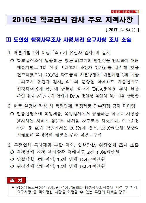 경남도는 8일 도교육청과 교육지원청, 도내 110개 학교를 대상으로 지난해 12월 12일부터 올해 1월 20일까지 실시한 학교급식감사 결과를 발표하였다. 도는 지난해 경남도의회 ‘학교급식사무조사특위’ 지적사항 이행실태와 2016년도 학교급식 지원예산 집행사항을 중점 감사하였다. 전국 최초로 학교급식에 대한 감사를 실시한 것이다.