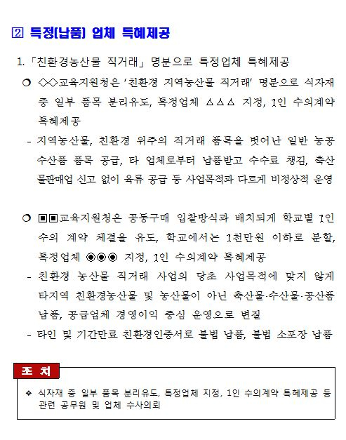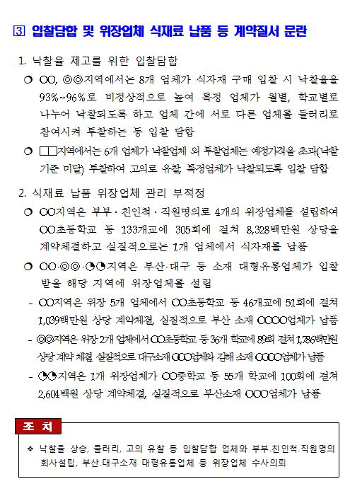 식자재 밴드업체들이 고용한 홍보영양사가 학교를 방문하여 자사 제품을 구매토록 로비활동을 통해 자사업체명과 제품명을 지정하는 특혜를 제공 받는가 하면, 연초에 수립하는 학교급식 계획에 특정업체와 제품을 지정하여 수의계약토록 하는 내용으로 학교운영위원회 심의를 받아 1인 수의계약을 통한 특혜를 제공받는 등 새로운 불법사례가 적발되기도 했다. 아울러, 식자재 납품업체들은 입찰 투찰 시 서로 모의하여 낙찰가를 비정상적으로 높여 월별, 학교별로 나누어 낙찰 되도록 서로 담합 하는가 하면, 서로 간에 다른 업체를 들러리로 참여시켜 투찰 또는 고의로 유찰시켜는 방식으로 입찰 담합하여 부당이익을 취하기도 했다. |  | | | ⓒ hy인산인터넷신문 | |