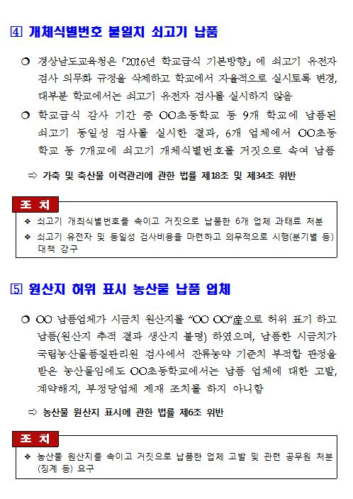 도는 이러한 불법행위를 척결하기 위해 ▶법률 위반 5개 업체를 고발하고 ▶특정업체 밀어주기․입찰담합 등 유착이 의심되는 29개 업체와 5개 기관 관련 공무원을 수사의뢰하는 한편 ▶중대과실로 잘못된 행정을 한 51개 기관 관계자에 대한 처분은 교육감에게 요구하고 ▶단순 경미한 과실 215개 학교에 대하여는 주의를 촉구하였다. |  | | | ⓒ hy인산인터넷신문 | |