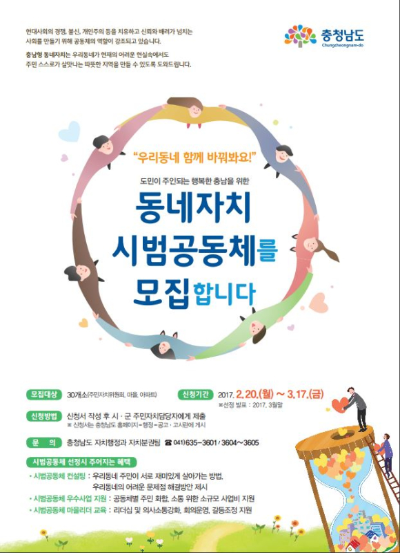 충남도는 올해 ‘충남형 동네자치 시범공동체’ 30곳을 육성키로 하고, 참여 희망 공동체를 모집한다고 19일 밝혔다. 동네자치 시범공동체 육성은 마을(공동체) 내 보이지 않는 갈등 조정, 주민 관계망 촉진 등을 통해 공동체 내부 신뢰와 배려를 회복시키기 위한 사업이다. 공모 대상은 도내 마을과 아파트, 읍·면·동 주민자치위원회 등이다. 사업 참여 희망 공동체는 20일부터 다음 달 17일까지 시·군 주민자치 담장자에게 신청서를 제출하면 된다. 도는 신청 공동체를 대상으로 심사를 실시, 내달 말 사업 대상을 최종 발표한다. 동네자치 시범공동체에 선정된 마을 등은 △주민들이 서로 재미있게 살아가는 방법이나 △동네의 어려운 문제점 해결 등에 대한 컨설팅을 받게 된다. 또 △공동체별 주민 화합과 소통을 위한 사업비를 지원받게 되며, △리더십과 의사소통 강화, 회의 운영, 갈등 조정 등의 교육도 지원받는다. 도 관계자는 “시범공동체는 민주적 의사 결정을 학습하고, 주민 참여를 위한 훈련창구로써의 역할을 하게 될 것”이라며 이번 공모에 대한 도내 공동체의 관심과 참여를 당부했다. 한편 도는 지난 2014년부터 마을, 아파트, 읍·면·동 주민자치위원회를 대상으로 시범공동체 56곳을 육성해오고 있으며, 시범공동체 역량 강화 컨설팅 등을 통해 주민 스스로 따뜻한 지역을 만들어 나아갈 수 있도록 하고 있다. |  | | | ⓒ hy인산인터넷신문 | |