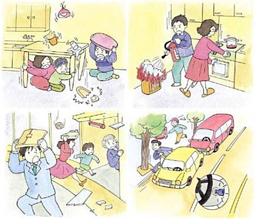 지진발생시 행동요령 등 주요내용을 보면, 집안에 있을 때는 우선 튼튼한 테이블 등의 밑에 들어가 그 다리를 꽉 잡고 몸을 피하고, 불이 났을 경우 침착하고 빠르게 끄고 가스밸브 등을 잠가 화재나 폭발요인을 제거해야 한다.
