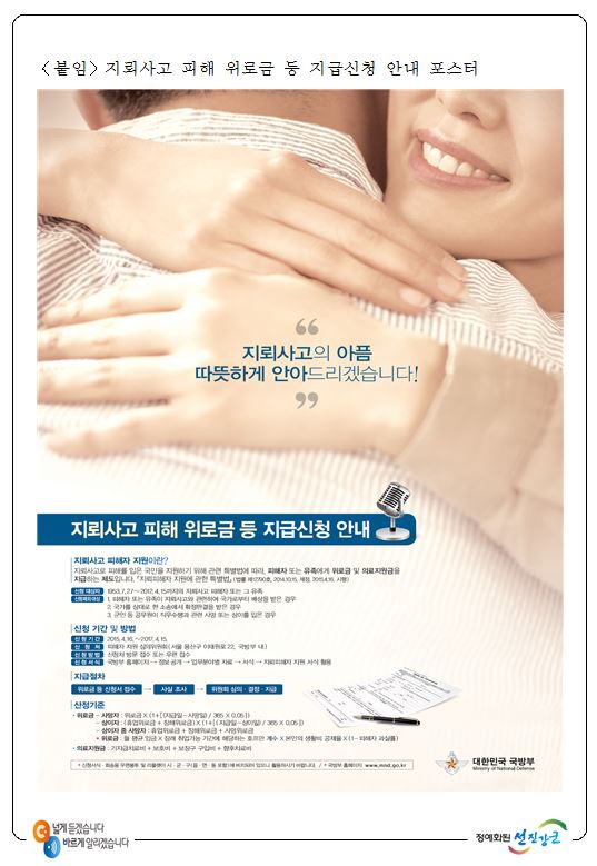 【국방부】 위로금 신청 마감일이 다가옵니다. 서두르십시오.- 2017.4.15. 까지만 신청 받습니다. -정호 기자 / |