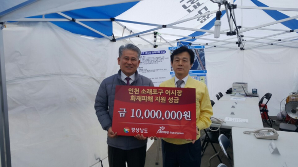 【경상남도】 인천 소래포구 화재피해 성금 천만 원 전달- 21일 조규일 서부부지사 방문, “조속히 정상화 되어, 명품시장으로 거듭나길”- 경남도, 전통시장 화재예방 안전관리대책 마련해 화재예방에 안간힘 정호 기자 / |