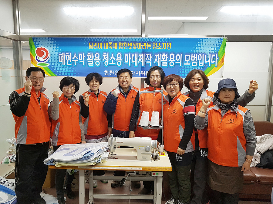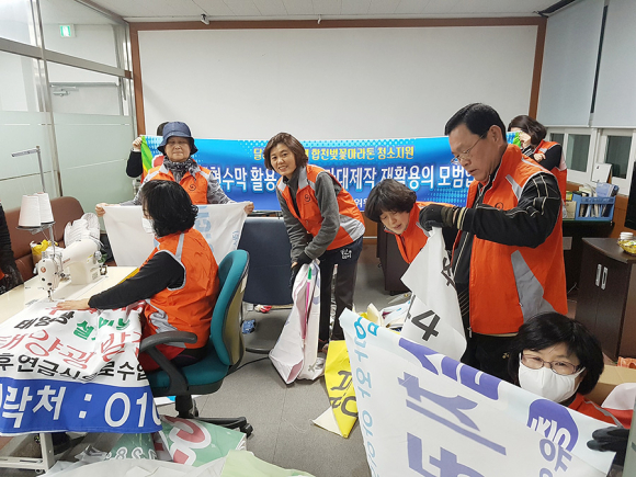 【합천읍주민자치위원】 폐현수막으로 청소용 마대제작 배부정호 기자 / |