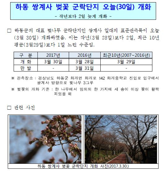 【기상청】 하동쌍계사벚꽃30일 개화정호 기자 /