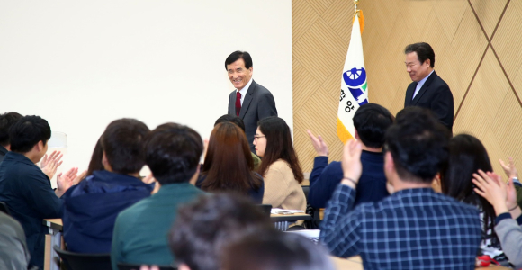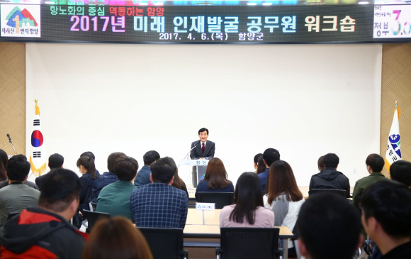 【함양군】임창호 군수, “변화를 두려워말고 새로움에 도전하라”함양군, 6일 1~2년차 공무원 51명 대상 미래인재발굴 공무원 워크숍 …특강, 역량강화 체육대회 등정호 기자 / |