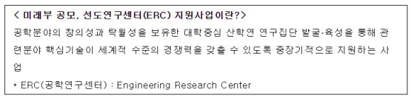 | 《추진경과》 경남도와 경상대는 항공분야 산학연 협력 네트워크와 오랜 연구경험을 바탕으로 지난해 12월 2일 미래창조과학부의 2017년 선도연구센터 공학분야(ERC) 공모사업에 응모하기로 의견을 모았다. 또한 지역대학의 약점을 극복하고 국내 최초로 항공분야 선도연구센터를 구축하기 위해 대학․관련기관․기업 등과 함께 대규모 컨소시엄을 구성해 신청서를 제출하였다. 이후 경남도와 경상대학교의 꾸준한 협조와 노력으로 4월 14일 발표평가와 본평가 등을 통해 전국의 최상위권 4개 대학 컨소시엄과의 경합을 거쳐 최종 사업자로 선정되었다. 한편 진주․사천지역 항공산업을 기반으로 경상대는 1996년부터 항공기계시스템 분야 특성화대학으로 지정되어 기계항공정보융합공학부 및 항공우주특성화대학원을 개설하여 운영중이다.