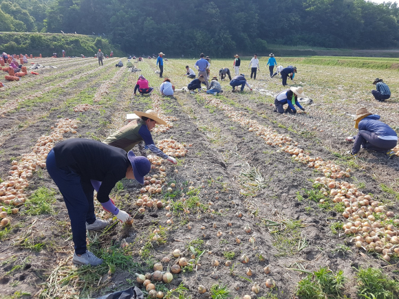 【함양군】 구슬땀 흘리며 양파수확 일손돕기 실시9일 군청 실과소·유관기관 350여명 고령장애 등 기반취약 15개 농가 4만 5042㎡ 도와정호 기자 / |