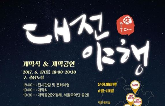 대전광역시(시장 권선택)는 ‘2017년 대전 문화재 야행 프로그램 「夜 좋다」’를 추진한다고 밝혔다. 「夜 좋다」는 대전에서는 처음으로 개최되는 문화재 야행 프로그램으로 대전광역시가 주최하고 대전문화재단(대표 이춘아)과 기호문화유산활용진흥원(대표 김선의)이 공동으로 주관하며 지역의 문화유산 단체 등이 후원한다. 야행은 문화재를 활용한 품격 높은 야간향유 프로그램으로 문화재를 피상적으로 살펴보는 일반 탐방과는 달리, 야간시간대를 활용하여 문화재를 직접 몸으로 느껴보며 먹거리와 공연 등의 볼거리를 함께 즐길 수 있는 프로그램이다. 「夜 좋다」는 개막행사와 함께 진행되는 ‘축제형’과 다양한 문화유산을 찾아가는 ‘탐방형’으로 크게 구분하고 있다. 축제형 프로그램은 6월17일에 옛 충남도청사에서 국악인 오정해 씨의 사회로 진행되는 개막행사‘대전의 추억을 노래하다(옛 충남도청사 본관)’를 시작으로 ‘원도심 원정대’와 ‘목척교 그땐 그랬지’ 등으로 구성되어 있다. 탐방형 프로그램은 보문산, 동춘당, 남간정사 등 우리시 주요 문화유산에서 ‘달빛 詩길 걷기’, ‘동춘당가 400년 여름 생신상’, ‘남간정사, 조선건축에 빠지다’ 등의 소주제로 7월 8일부터 10월 21일 기간 중에 총 9회가 실시될 예정이다.