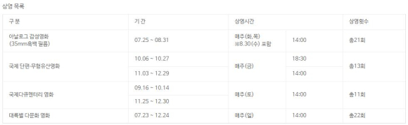 매주 화⋅목요일 오후 2시에 상영하는 35mm흑백영화는 부산 영화의 전당에서 소장하고 있는 중국의 거장 ‘허우 샤오시엔’과 일본의 ‘오즈 야스지로’, ‘미조구치 겐지’의 작품 등 총 13편을 엄선하여 상영한다. 또한, 「국제 단편영화제」는 애니메이션 묶음 작품 ‘패밀리 애니메이션’과 일반 작품 ‘우리들의 추억 or 너와 나의 추억’ 등 총 6편을 상영하며, 국립무형유산원과의 협력을 통해 이탈리아의 ‘손의 제스처’, 파푸아뉴기니의 ‘갓의 죽음 : 장례전통에 관한 연구’ 등 국가별 무형유산 다큐멘터리 7개의 작품을 10월 6일부터 연말까지 상영한다. 또한, 세계 여러 나라의 다큐멘터리를 한눈에 볼 수 있는「국제다큐영화제」에서는 <문명:도시국가>을 주제로 ‘어느 독일인의 삶’과 ‘로드’라는 중국 작품을 상영한다. 다큐는 어렵고 지루하다는 편견을 깰 신나고 흥미진진한 다큐멘터리 영화제는 오는 9월 16일부터 매월 토요일 오후 2시에 진행되며 오는 12월까지 총 11회를 상영한다. 제3세계의 영화를 발굴, 상영하는「대륙별 다문화 영화제」는 각국 대사관과 서울역사박물관이 공동 주최했다. 아제르바이잔의 ‘부타’, ‘액트리스’, ‘호스티지’ 등의 3편을 시작으로 우루과이, 불가리아, 케냐, 에콰도르, 이란, 남아프리카공화국, 이라크, 터키, 멕시코, 콰테말라 등 세계 11개국의 작품을 발굴 상영한다. 제 3세계 국가의 다양한 영화는 동시대를 살아가는 서울시민에게 다양한 문화적 간접 체험을 경험할 수 있는 또 다른 감흥으로 다가온다. 국제 다양성 영화제의 자세한 프로그램 내용은 서울역사박물관 홈페이지(www.museum.seoul.kr)에서 확인할 수 있다.(문의 02-724-0297)