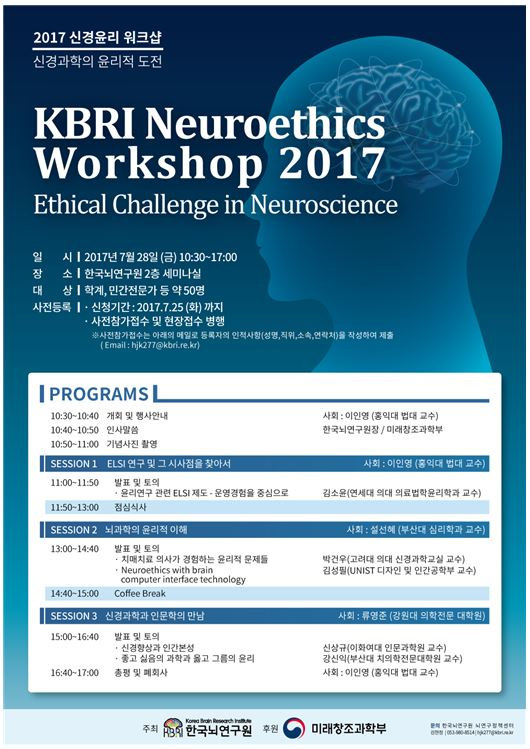 신경윤리 워크숍은 과학기술정보통신부가 4차 산업혁명에 대비한 대형 뇌연구사업을 본격적으로 추진하는 시점에서 뇌과학기술이 미칠 윤리적, 법적, 사회적 문제를 고찰하고 신경윤리에 대한 이해를 높이기 위해 마련되었다. 신경과학, 의학, 의철학, 과학철학, 법학, 심리학 등 학계의 다양한 전문가들이 참가한다.