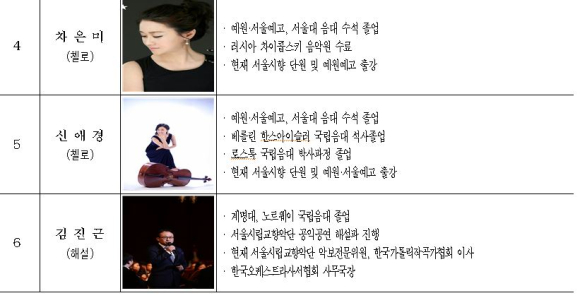 서울시향 단원들로 구성된 이번 공연은 바이올린, 비올라, 첼로, 더블베이스 등 현악 5중주와 클라리넷, 바순, 오보에, 첼로 등이 협연으로 진행되며 해설은 김진근 악보전문위원이 맡는다. 현악 5중주는 주연주(바이올린), 김민용(바이올린), 이선주(비올라), 차은미 or 신애경(첼로), 조정민(더블베이스), 협연자는 이창희(클라리넷), 장명규(바순), 류경균(오보에), 차은미(첼로), 신애경(첼로)이다.