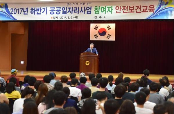진주시는 공공일자리사업 참여자들의 안전의식 고취를 위해 2017년 하반기 공공일자리사업 안전보건 교육을 실시했다. 3일 진주시청 시민홀에서 실시한 공공일자리사업 안전보건교육에는 공공근로사업, 지역공동체일자리사업 참여자 및 관계공무원 230여 명이 참석했다.
