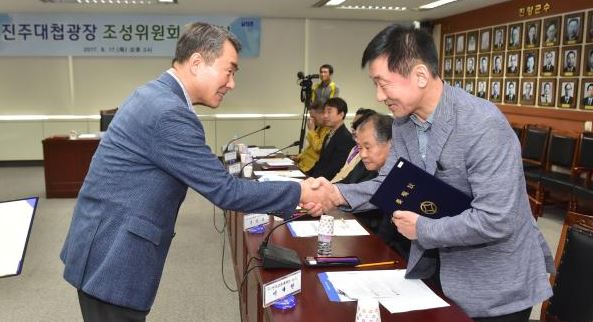 진주시는 17일 오후 2시 시청 5층 상황실에서 이창희 시장을 비롯한 위원 19명이 참석한 가운데 진주대첩광장 조성위원회 위원 위촉식과 회의를 개최했다. 진주대첩광장 조성위원회 위원은 교수, 학계, 예술·경제인, 시민사회, 봉사단체, 언론인 등 각 분야 전문가를 추천 받아 선정했고 위촉된 위원은 향후 2년간 진주대첩광장 조성위원으로 활동 하게 된다.