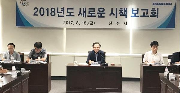 진주시는 18일 오후 2시 시청 상황실에서 송병권 부시장 주재로 국·소장 및 전 부서장이 참석한 가운데 새로운 시책 보고회를 개최했다. 이날 시책 보고회에서는 신성장동력산업 활성화 방안, 일자리 창출 및 지역경제 활성화 방안, 혁신도시 완성에 따른 시너지 효과 극대화 방안(혁신도시 이전공공기관 지역동화사업), 남강유등축제 및 관광 도시 발전 방안, 친환경 명품 자전거도시 조성 방안, 원도심 활성화 방안, 서민복지 및 시민 편익 증진 등 그 동안 직원들이 연구·발굴한 시책 중에서 우선 실행 가능한 시책에 대해 보고와 활발한 토론이 이뤄졌다.