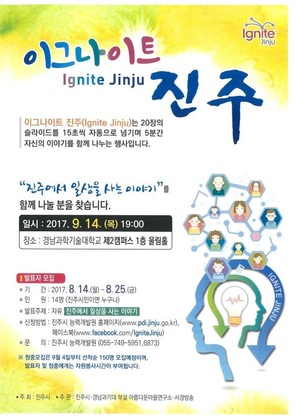 진주시민이면 누구나 신청할 수 있으며 모집인원은 14명이다. 진주에서 일상을 살아가는 평범한 시민들의 재미있고 감동적인 경험을 포함한 자유로운 주제로 발표할 수 있으며 신청서는 능력개발원 홈페이지 또는 페이스북(www.facebook.com/Ignite.Jinju)으로 제출하면 된다.