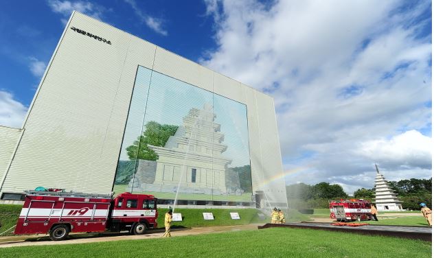 | 이날 훈련은 문화재청(국립문화재연구소, 국립부여문화재연구소), 익산시, 문화체육관광부(국립미륵사지유물전시관), 익산경찰서, 군부대, 익산소방서, 익산보건소, 한전익산지사, KT익산지사 등이 합동으로 참여한 실제훈련이다. 익산 미륵사지 석탑(국보 제11호) 보수현장과 국립미륵사지유물전시관에 적이 침투한 것을 가정한 상황 속에서 군부대가 적을 퇴치하고, 소방관과 자위소방대가 화재진압과 환자이송을, 경찰이 국가무형문화재인 석장을 보호하는 역할을 분담했으며, 유물전시관의 주요유물을 안전한 장소로 분산해 옮기고, 피해입은 석탑을 긴급 복구하는 훈련이 이루어졌다. 훈련에는 소방차, 구급차, 군용트럭, 지게차 등 대형장비 11점이 투입됐다. 훈련에 참석한 문화재청장은 “이번 훈련을 통해 소중한 유네스코 세계유산인 익산 미륵사지의 가치를 되새길 수 있었으며, 익산시, 관계기관들과의 상호 공조를 통한 이번 실제 합동훈련은 비상 재난 상황에 대한 역량을 높이는 데 큰 도움이 될 것이다”라고 강평했다. |