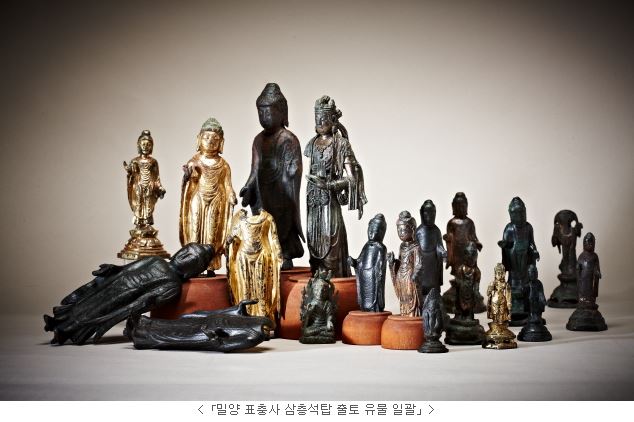 문화재청(청장 김종진)은 「밀양 표충사 삼층석탑 출토 유물 일괄」 등 3건을 국가지정문화재(보물)로 지정 예고하였다. 「밀양 표충사 삼층석탑 출토 유물 일괄(密陽 表忠寺 三層石塔 出土 遺物 一括)」은 1995년 삼층석탑 해체보수 작업 중 기단(基壇) 적심부에서 발견되었다. 이들 유물은 통일신라 시대부터 고려 시대에 이르는 20구의 금동불상과 탑에 봉안된 여러 공양물, 석탑의 보수를 알려주는 조선 초기의 ‘개수탑기비(改修塔記碑)’(1491년)를 포함하고 있다. 불상 중에는 머리와 대좌 등이 파손된 것들도 있었지만 출토지가 분명한 곳에서 시기를 달리하는 많은 불상이 함께 발견되었다는 점에서 중요한 의의가 있다. * 개수탑기비(改修塔記碑): 탑을 수리한 연혁을 새긴 비석
