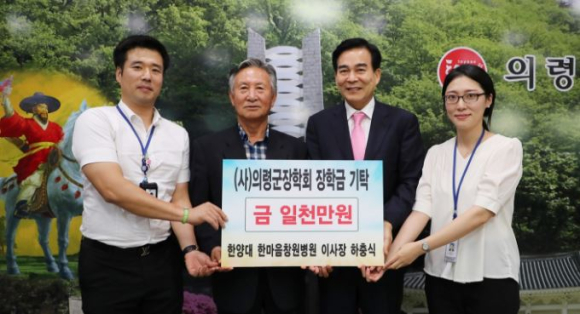 한양대 한마음창원병원 하충식 이사장은 지난 20일 의령군장학회(이사장 오영호 의령군수)에 지역인재육성을 위해 써달라며 장학금 1000만원을 기탁했다. 하충식 이사장은 “경남의 의료발전과 지역의 소외계층 학생들의 학업 지원을 위해 평생 노력하고 있다”며 “의령지역 학생들이 보다 나은 교육환경에서 학창시절을 보내 사회에 보탬이 되는 인재로 성장하길 희망한다”고 기탁 소감을 밝혔다.