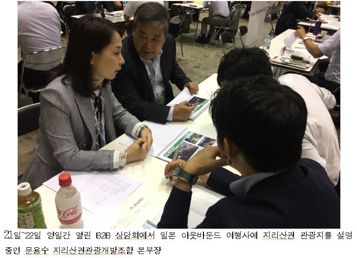 | 2012년부터 지속적인 참가로 꾸준히 인지도를 다져온 조합은 이번 박람회에서는 최신 관광트랜드에 맞추어 체험중심 볼거리, 먹거리, 디저트, 트래킹, 템플스테이 등을 중심으로 당일 및 1박2일 옵션투어와 계절별 여행 코스를 중점적으로 현지 여행사들에게 어필했다. 21일~22일 양일간 열린 국제상담회에서는 JTB, 일본여행 등을 비롯 10개 아웃바운드 여행사와의 B2B 세일즈콜을 통해 지리산권의 다양한 관광지로서의 매력홍보 및 내년 여행상품개발을 위한 다양한 테마기획 방안을 모색했다.