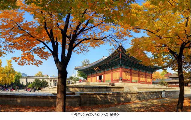 문화재청(청장 김종진)은 우리나라의 고유 명절인 추석을 맞이하여 연휴기간(9.30.~10.9. / 10일간)에 전 국민을 대상으로 4대궁‧종묘, 조선왕릉, 유적관리소(현충사, 칠백의총, 만인의총)를 휴무일 없이 계속 무료개방(창덕궁 후원, 경복궁 야간 특별관람(9.30.) 제외)한다. 아울러 평소 예약제로 운영되는 종묘는 이 기간에 자유롭게 관람할 수 있다. 더불어 열흘간의 황금연휴를 맞아 관람객을 위한 다양한 추석맞이 문화행사를 마련하였다. ▲ 먼저 덕수궁에서는 대한제국 시기 고종이 외국공사를 접견했던 의례와 연희를 재현한 ‘대한제국 외국공사 접견례(9.30.~10.1./10.7.~8.)’가 정관헌과 즉조당 앞에서 펼쳐지고, ▲ 창경궁에서는 궁궐의 일상모습을 재현한 행사 ’궁궐 일상을 걷다(10.7.~8.)‘가 진행된다.