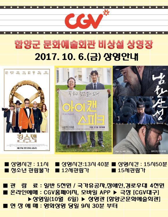 6일(금) 11시에는 킹스맨 : 골든서클(감독 매튜 본, 주연 콘린 퍼스·줄리안 무어, 청소년 관람불가), 13시 40분에는 <아이캔스피크>(감독 김현석, 주연 나문희·이제훈, 12세관람가), 15시 50분에는 <남한산성>(감독 황동혁, 주연 이병헌·김윤석·박해일, 15세 관람가)