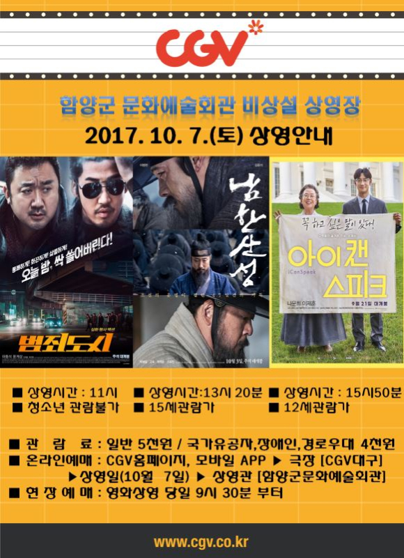| 함양군은 긴 추석연휴 마땅한 즐길거리가 없는 군민들을 위하여 함양군문화예술회관 비상설영화상영장에서 10월 6일(금) ~ 7일(토) 양일간 각 3회차씩 특별상영을 하기로 결정하였다.