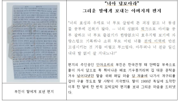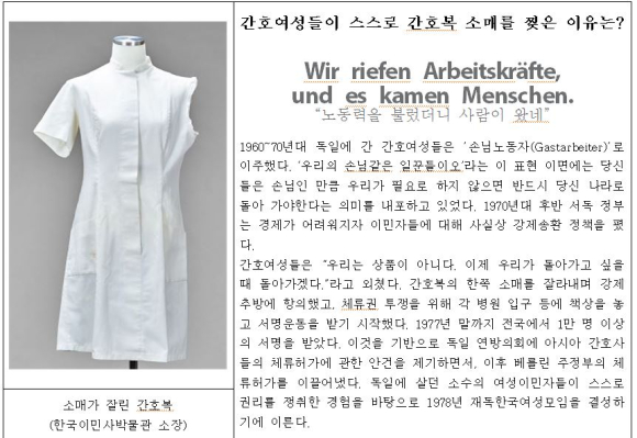 -독일로 간 한국 간호여성들의 이야기, 오는 10.9일까지 서울역사박물관 기획전시실에서 전시 -한국 산업화가 진행되던 1960~70년대 독일로 간 간호 여성들의 삶과 기억을 공감할 수 있는 기회 될 것 -한국현대사와 연결된 간호 여성들이 삶이 담겨진 사진, 영상 등을 통해 시민들의 뜨거운 반응 보여 -독일로 간 그리운 딸에게 보내는 아버지의 편지, 당시 간호여성들이 스스로 간호복 소매를 찢은 이유 등 시민들의 관심 집중