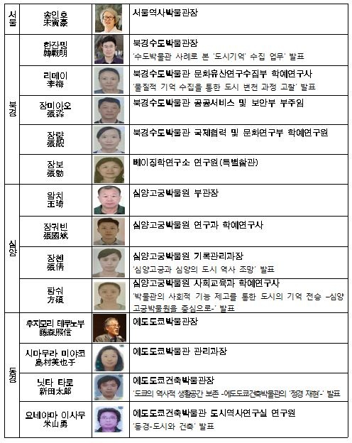 서울역사박물관의 전시 사례, 심양고궁박물원의 교육·문화행사 및 문화창의브랜드 구축에 관한 사례, 에도도쿄박물관 분관인 에도도쿄건축박물관의 건축물 보존의 사례를 비롯하여 북경 수도박물관의 소장품 수집 사례를 차례로 발표한다. 심포지엄에 앞서 송인호 서울역사박물관장은 “베이징, 선양, 도쿄 그리고 서울은 오래전부터 수도로서의 지위를 유지해왔으며, 그만큼 두터운 역사층위가 누적되어 있는 역사도시이다. 아울러 지난 이십세기에 급격한 변화를 겪으면서 성장한 거대도시이다.