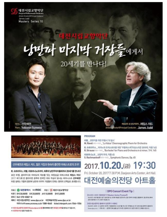 | 대전시립교향악단이 오는 10월 20일 오후 7시 30분 대전예술의전당 아트홀에서 반 클라이번 콩쿠르에서 한국인 최초로 우승한 선우예권과 함께하는 마스터즈 시리즈 10‘낭만파 마지막 거장들에게서 20세기를 만나다!’공연을 개최한다. 이번 연주는 로린 마젤, 클라우디오 아바도의 계보를 잇는 최정상급 마에스트로 제임스 저드 예술감독의 지휘 아래, 한국인 최초로 반 클라이번 콩쿠르에서 우승한 피아니스트 선우예권이 함께한다. 높고 맑은 하늘과 청명한 가을 분위기를 흠뻑 느낄 수 있는 감성적인 곡으로 채우는 이번 공연은 라벨의 관현악을 위한 무용시 ‘라 발스’를 시작으로 R. 슈트라우스의 피아노와 오케스트라를 위한‘부를레스케’, 마지막으로 라흐마니노프의‘교향적 무곡’을 선보인다. 공연의 서막을 열어줄 라벨의 관현악을 위한 무용시‘라 발스’에서‘라 발스’는‘왈츠’라는 뜻으로, 왈츠의 왕 요한 슈트라우스에 대한 존경을 담아 만든 곡이다. 라벨 스스로 이 곡을‘빈 왈츠의 예찬’이라고 불렀는데, 빈의 궁정 무도회를 주제로 삼아 왈츠의 영광을 재현한 작품으로 매우 화려하고 우아하다.
