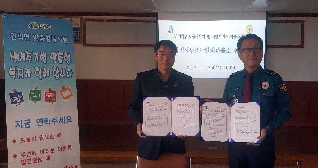 파출소와 면사무소 지역 복지사각 없애기 합심25일 함양군 안의면-안의파출소 위기가구 맞춤 복지 업무협약정호 기자 / |