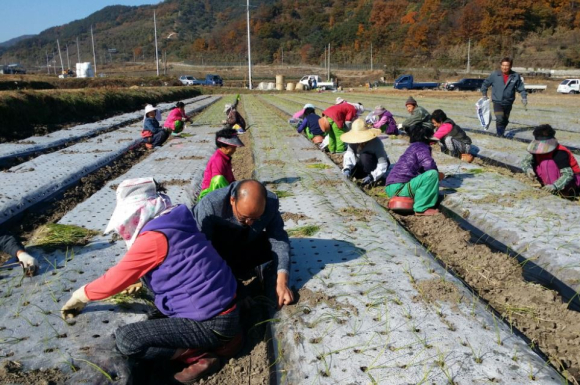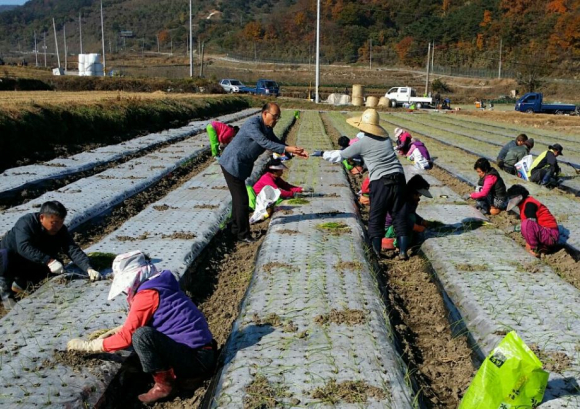 함양군 휴천면 금반마을 양파 공동 파종작업9일 1,300여㎡ 공동 작업, 내년 수확 후 판매 수익금 마을 공동기금 조성정호 기자 / |