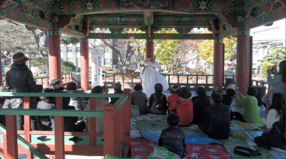 | 오후에는 함양 상림공원에 위치한 함화루(경남유형문화재 제258호)에서도 단청 및 문화해설이 이어졌다. 낙엽이 떨어지는 나무를 배경으로 가야금(가야금산조 성금련류), 한국무용(정재만류 살풀이·박병천류 진도북춤), 판소리(단가 중 사철가, 사랑가) 등 전통공연이 ‘경상남도 시도유형문화재 제90호’로 지정되어있는 ‘학사루’에서 진행되었다. 문화재 안에서 느끼는 전통공연은 참여자들의 오감을 자극하며, 옛 선비의 정취와 풍류를 느껴보는 특별한 시간이 되었다.