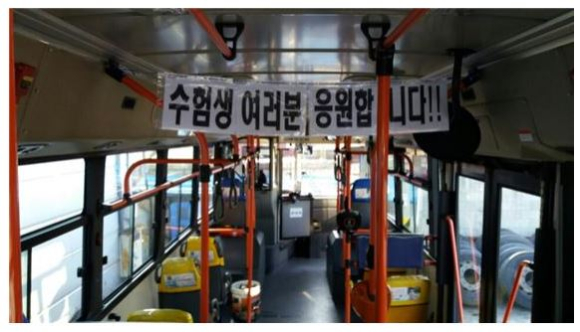 한편, 대전시 버스업체는 23일 수능일 수험생 이동 편의를 위해 버스 전면에 시험장명 및 하차할 정류소명을 기재한 안내문과 함께‘수험생 여러분 응원합니다’라는 응원 메시지도 부착 운행하고 있다.