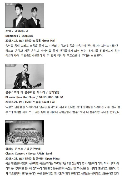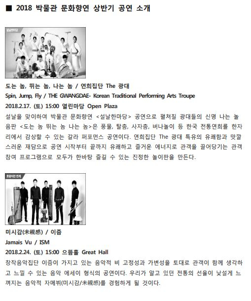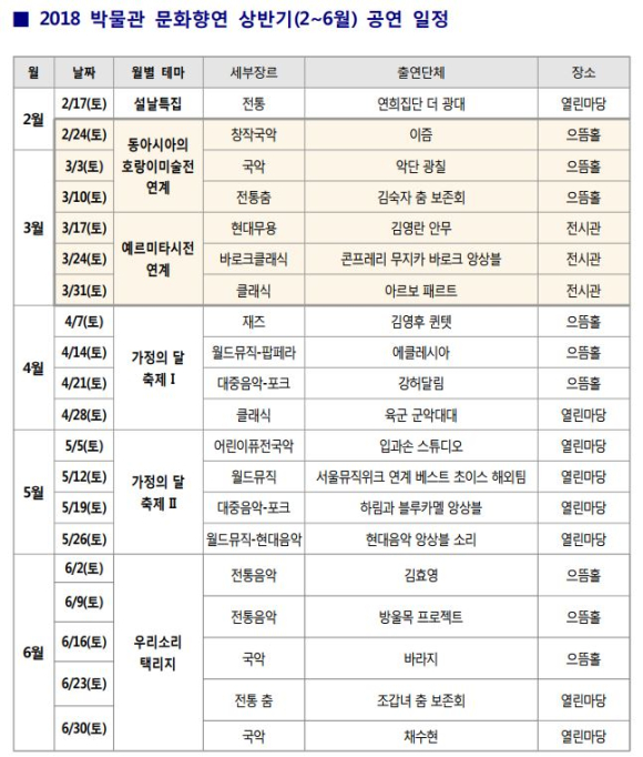 ㅇ 행 사 명 : 2018 박물관 문화향연(무료관람) ㅇ 기 간 : 2018년 2월 17일(토)~11월 24일(토)(매주 토요일 및 공휴일/ 총 41회) ㅇ 장 소 : 국립중앙박물관 열린마당, 으뜸홀, 기획전시실 내 ㅇ 주최/주관 : 국립중앙박물관/국립박물관문화재단 ㅇ 문 의 : 1544-5955 www.museum.go.kr / www.theateryong.or.kr