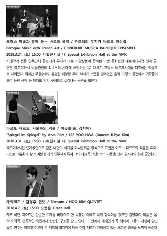 | 특히, 3월 한 달간은 현재 국립중앙박물관에서 전시되고 있는 동아시아의 호랑이 미술전과 예르미타시전을 주제로 한 전시연계공연을 마련하여 관람객으로 하여금 보다 더 깊이 있고 풍요로운 전시와 공연을 감상할 수 있게 할 예정이다.