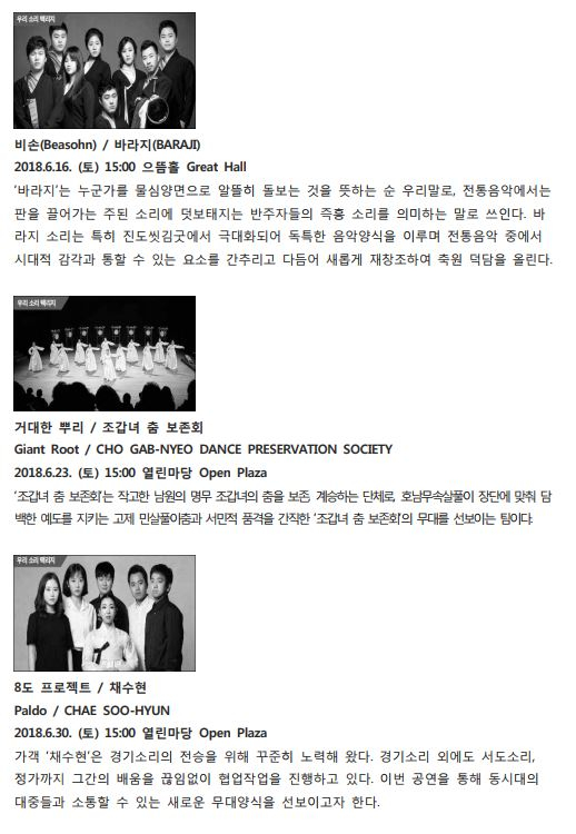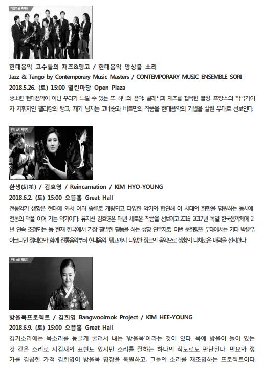 | 이외에도 육군 군악대의 클래식 콘서트, 그룹 신촌블루스 보컬 출신 블루스의 디바 강허달림, 집시풍의 월드뮤직 밴드 하림과 블루카멜 앙상블 등 클래식, 무용, 국악, 대중음악 등 남녀노소 누구나 웃고 즐길 수 있는 다양한 장르의 공연 프로그램을 마련했다.