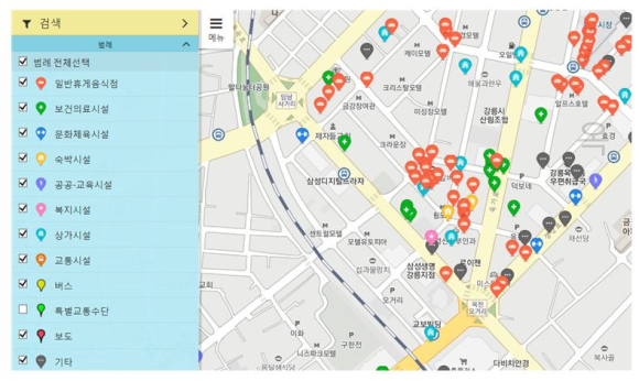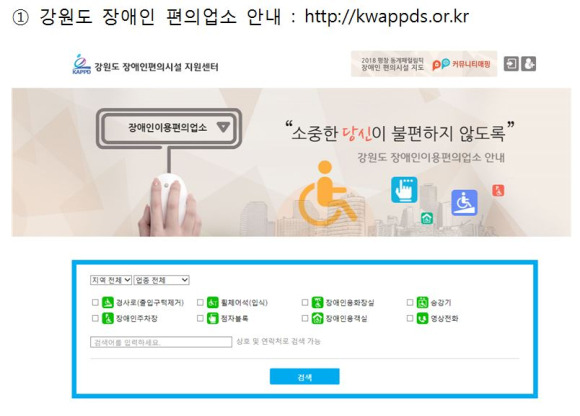 - 특히, 강원도 편의시설지원센터 홈페이지(http://kwappds.or.kr) 에서는 “장애인 편의지도” 정보를 함께 이용할 수 있다. 편의지도 서비스는 (사)커뮤니티 매핑센터(대표 임완수)의 사회공헌 활동으로 제공하는 것으로 PC 및 맵플러 앱(MapplerK2*)을 통해 현위치에서 가까운 편의업소를 한 눈에 확인할 수 있는 장점이 있다.