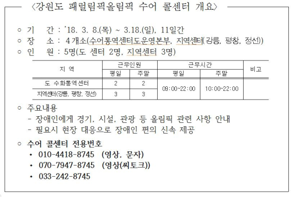 아울러, 동계패럴림픽을 관람하는 청각‧언어 장애인의 불편 해소를 위해 수어 콜센터*도 개막일부터 휴일 없이(평일 9시~22시, 주말 10시~22시)하여 패럴림픽에 대한 다양한 정보를 정확하고 신속하게 제공할 계획이다.