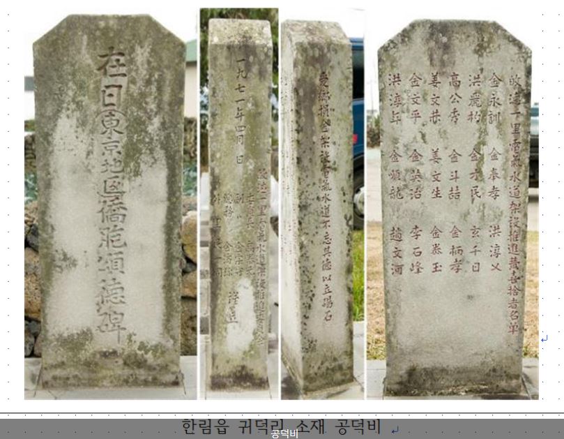 제주특별자치도는 올해 서귀포시 지역에 분포해 있는 재일제주인 관련 공덕비나 기념물 등에 대한 전수조사를 실시하고 이에 대한 자료집을 발간할 계획이다. 재일제주인 공덕비 및 기념물 조사 사업은 2012년 이후 진행되어 온 「재일제주인 故鄕愛 발자취 기록화」사업과 연계하여 제주전역에 분포해 있는 재일제주인 관련 공덕비와 기념물 등을 전수 조사해 자료집을 발간하는 사업으로 2016년에 제주시 동부지역(동지역, 조천읍, 구좌읍, 우도면)에 분포한 공덕비 및 기념물 252기, 2017년에는 제주시 서부지역 (애월읍, 한림읍, 한경면) 211기에 대한 조사를 실시하고 자료집을 발간하였다.