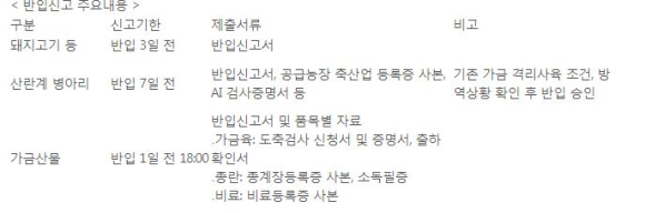 ○ 타 시․도에서 제주도로 가금산물(닭고기, 오리고기, 계란, 계분비료)이나 돼지고기 등을 반입하고자 하는 경우 『반입금지 가축 및 그 생산물 품목 고시』에 따라 반드시 동물위생시험소로 사전에 신고하여 주실 것을 당부하였다.(☏ 064-710-8551~3, Fax 064-710-8529)