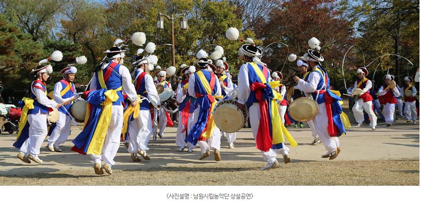 | 남원시립농악단은 남원 시민의 정서 함양과 전통 농악을 계승하고 발전시키기 위하여 무형문화재 제7-4호인 류명철 선생과 전수자 등 수준 높은 농악단원으로 구성되어 춘향제 및 한 여름밤의 소리여행 등 주요행사를 이어가고 있다.
