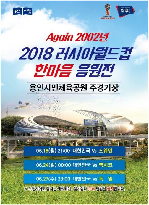 2018 러시아 월드컵 기간 중 용인시민체육공원에서도 대한민국 국가대표팀의 승리를 바라는 시민들의 ‘대~한민국’ 응원 함성이 울려 퍼진다. 용인시는 월드컵 본선에 진출한 대한민국 국가대표팀의 선전을 기원하고 시민화합의 장을 마련하기 위해 용인시민체육공원 주경기장에서 전광판과 무대를 중심으로 다채로운 행사가 펼쳐지는 응원전을 개최한다. 행사는 대한민국 대표팀의 F조 본선 조별리그 세 경기에 맞춰 한국시간 기준으로 18일 오후 9시 스웨덴전을 시작으로 24일 0시 멕시코전, 27일 오후 11시 독일전에 걸쳐 열린다.