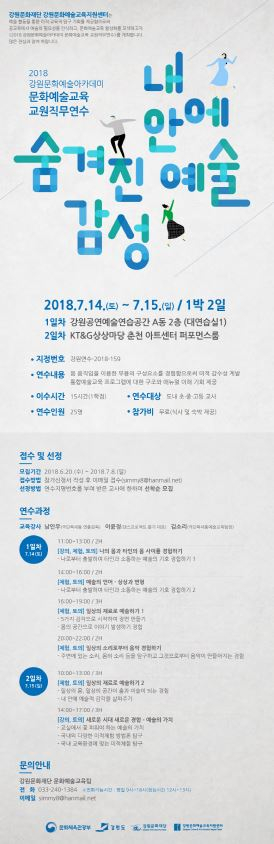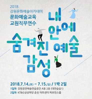 강원문화재단, ‘2018 문화예술교육 교원직무연수’ 연수생 모집-“내 안의 숨겨진 예술감성”과정 도내 초·중·고등 교사 25명 선착순 모집 - 내달 14~15일 양일간 총 15시간 진행정유근 기자 / |