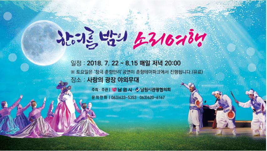 | 남원시립국악단의 국악공연으로 시작된 ‘한 여름밤의 소리여행’은 올해로 23년째를 맞았다. 그동안 여름 휴가철 남원을 찾아온 관광객 및 시민들에게 수준 높은 예술 공연을 펼치고 지역문화예술단체에 공연 기회를 제공하여 예술단체 역량 강화 및 볼거리 제공을 해오며 남원의 대표적인 여름철 상설공연으로 자리매김 했다. ‘한 여름밤의 소리여행’은 국악, 농악, 클래식, 대중가요, 포크 등 다양하고 풍성한 공연으로 구성된다. 올해는 12개 단체에서 총 22회 공연을 준비했으며, 공연 일정은 남원시 홈페이지에서 확인할 수 있다.