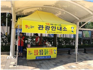 웰컴투동해시 협의회, 피서객 맞이 관광홍보 안내부스 운영- 망상해변, 천곡 천연동굴, 묵호항 여객선터미널에 설치 운영 - 협의회 회원 3~4명 배치하여 방문객에게 교통, 음식, 숙박 등 정보 제공김윤국 기자 / |