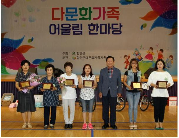 | 이날 한국 사회에 안정적으로 정착해 지역사회 봉사와 발전에 앞장선 한지화(가야읍), 박마가레타(가야읍), 한수연(함안면), 그도우가쯔미(여항면) 씨 등 결혼이민자 4명과 이에 격려와 지원을 아끼지 않은 다문화가정 시부모 이연옥 씨(칠원읍), 다문화가족지원사업 업무 유공으로 윤진선 씨에 대한 군수표창을 조 군수가 각각 수여했다.