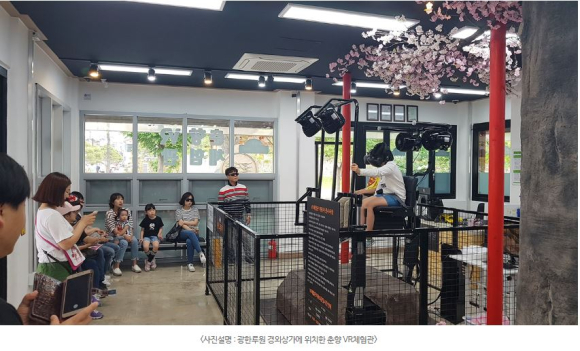 | 또한, 더욱 생생한 느낌을 받을 수 있도록 VR 시뮬레이터의 하우징작업도 추진하여 실제 가마와 같은 외형을 만들고, 그네의 배경이 되는 벚꽃이 핀 나무 아래서 그네를 타는 모습을 상상할 수 있도록 재현하였다. 경외상가가 이처럼 변신하는 데는 많은 노력이 있었다. 경외상가는 지난 1988년 철근콘크리트 구조로 건축돼 누수와 기와 파손, 낙석으로 땜질식 보수를 이어왔다. 광한루원을 방문하는 관광객의 안전사고 예방과 남원 대표 관광명승지 이미지 회복이 필요했다. 무엇보다 경외상가 활성화가 급선무였다. 지난해 문화재청과 전북도로부터 국비와 도비를 지원받고 시비를 더해 사업비 8억7,600만원(국비 6억5,200만원, 도비 1,400만원, 시비 2억1,000만원)을 들여 상가 리모델링과 지붕기와 교체, 인도 및 통행로 정비를 실시했다. 광한루원 경외상가 상인들도 지난 5월 번영회(회장 이천호)를 구성하여 상가 공동체 번영과 발전을 위해 친절하고 공정한 상행위로 고객을 맞이하는 등 즐겁고 알찬 남원관광 이미지 제고에 노력하고 있다. 한편, 남원시는 연중 국악 공연 및 춘향·몽룡 도우미, 이도령 가마타기, 지리산 사진전, 스크린에 비친 광한루원 등 각종 이벤트와 전시전을 실시하고 있다.